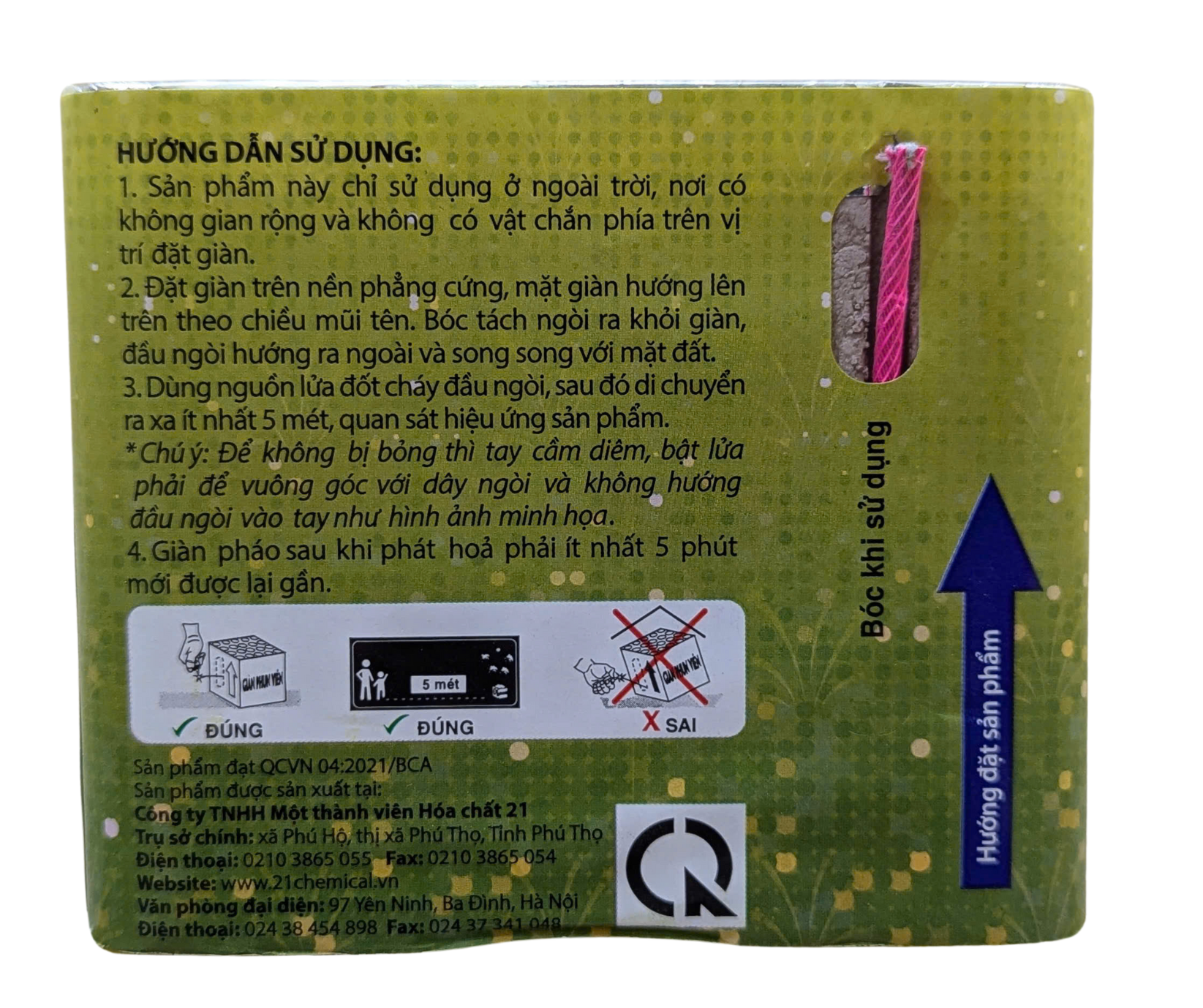 - Bước 2: Đặt sản phẩm thẳng đứng trên một bề mặt phẳng theo hướng mũi tên, tốt nhất nên đặt trên mặt đất, bê tông… không nên đặt trên bề mặt dễ cháy, có tính đàn hồi như ghế nhựa, bàn inox vì dễ gây nên đổ giàn pháo.