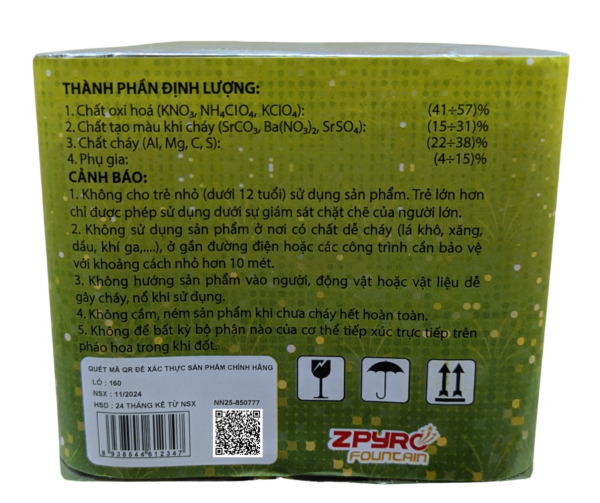 - Không sử dụng pháo hoa giàn phun viên nhấp nháy ở nơi có chất dễ gây cháy (xăng, dầu, khí ga,…). Khi sử dụng, không hướng sản phẩm vào người, động vật hoặc vật liệu dễ gây cháy, nổ